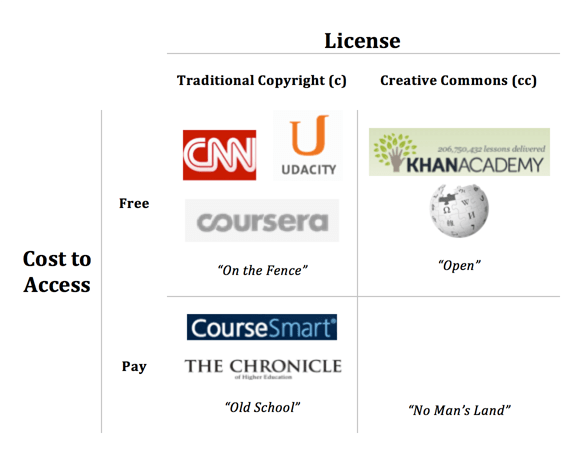 As I’ve been saying, the real risk of the On the Fence MOOCs (aka xMOOCs) is that they confuse people about “open.” “Open” does not “mean free to access but copyrighted,” like Udacity and Coursera are. Open means free access plus free 4R permissions. The On the Fence MOOCs are drawing energy and attention away from where the real battle is happening - in open educational resources. OER is the only space where everyone has permission to make and redistribute the changes necessary to best support learning in their local context. Consequently, OER is the only space where continuous quality improvement is possible, as I’ve been saying for years now. You can have all the analytics in the world telling you where your course needs improving, but without 4R permissions you’re not allowed to make those improvements.