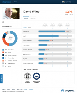 In a nutshell: You login with Facebook. Degreed pulls your Education information from Facebook and prompts you to add more detail and confirm it. Degreed then makes a best guess about the classes you would have taken and builds out a generic transcript for you. (In a future version you’ll be able to both (1) refine the generic transcript by hand or (2) upload a transcript so that trained squirrels can refine your profile for you and mark it “verified”.) You can then add other informal courses (e.g., from Udacity), Mozilla open badges, etc. to fill out your profile. Categorizing each formal or informal experience allows us to count these experiences toward points that help you level up (we use degree equivalents for levels) in a wide range of areas.