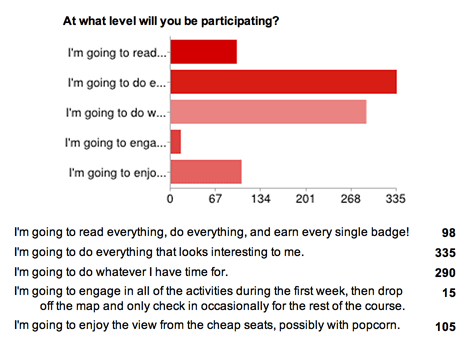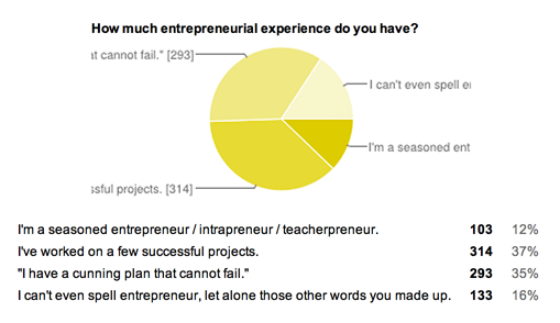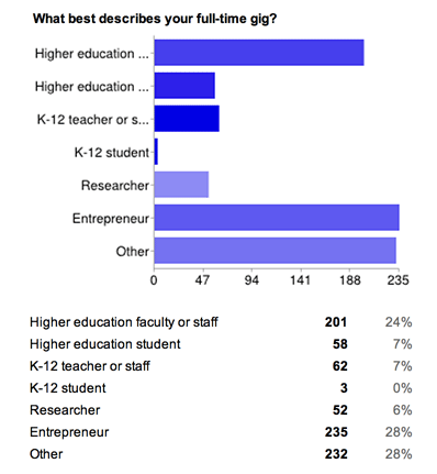 The most useful thing we did when we put the word out about the course was to invite interested people to fill out a simple form. We hoped this would give us an idea of what type of people were coming. A few weeks later, 850 people have indicated their intention to participate in the course. Fortunately for us, Google Forms has a handy feature that auto visualizes form responses. So, in case you’re interested, here are a few characteristics of the EdStartup 101 participants.