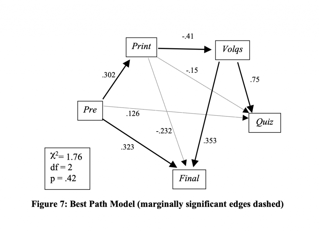 Other research from CMU explicitly connects the dots between (1) the significant impact of doing online interactive practice activities and (2) the somewhat common student practice of printing out their online learning materials. Unsurprisingly, students who print out their online learning materials don’t do as many of the online interactive practice activities (“Volqs” in the path diagram below). Consequently, students who print do worse on both quizzes and final exams than their peers who work online.