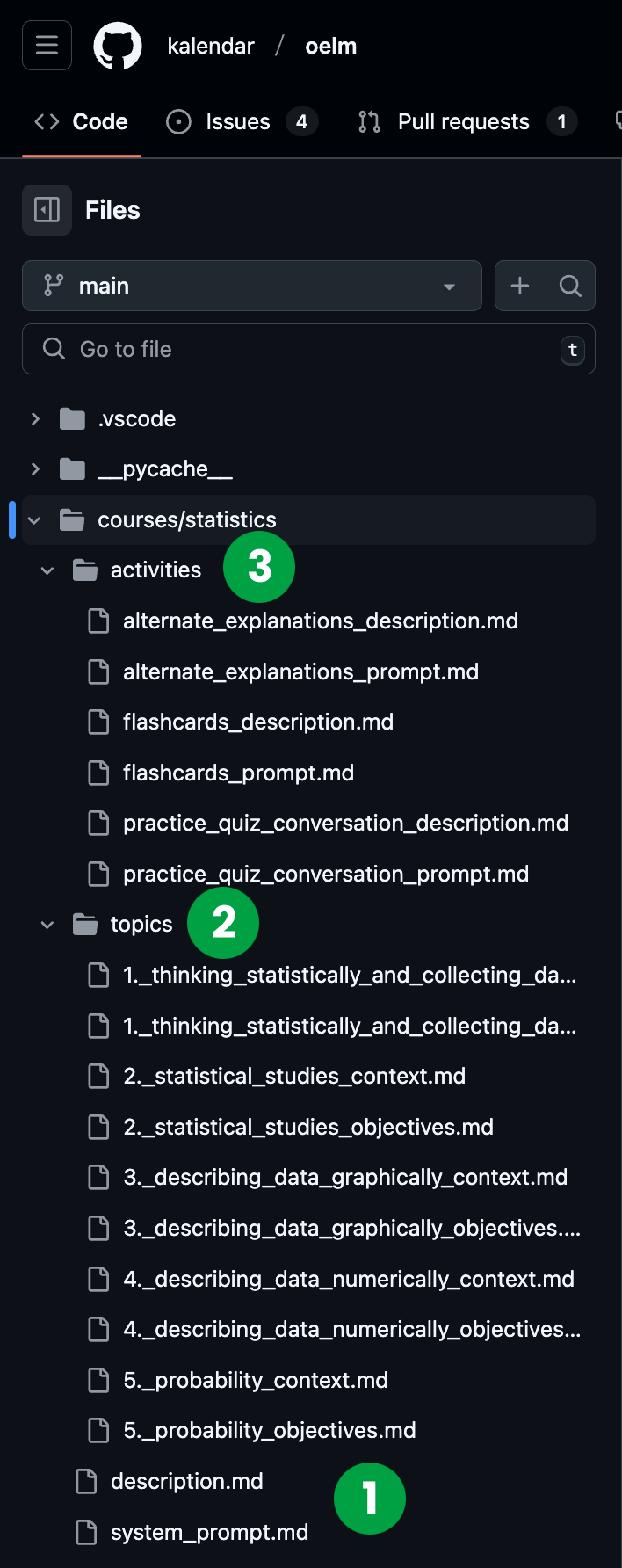 The OELMs source code has been updated on GitHub to include better documentation to help you get started as well more examples of content and activities. As you may remember from last week’s post about the OELMs architecture, the design goal of Open Educational Language Models is to combine the technical power of generative AI with the participatory power of open education. To help you see how that works, the initial implementation in GitHub is sub-optimized in order to make it easier to understand how to contribute. As you see in the demo content in the screenshot from GitHub below, each “course” in an OELM is comprised of three parts (as described last week):