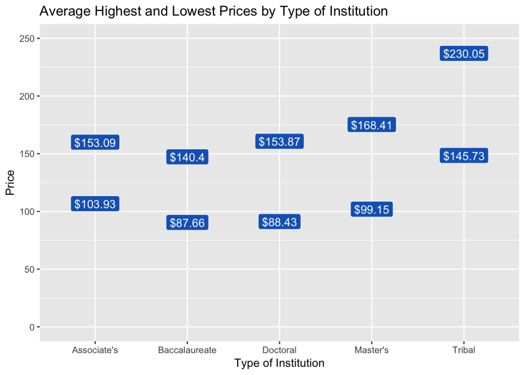 Across all available course materials formats, how do the average prices of the most expensive options and least expensive options vary across type of institution?