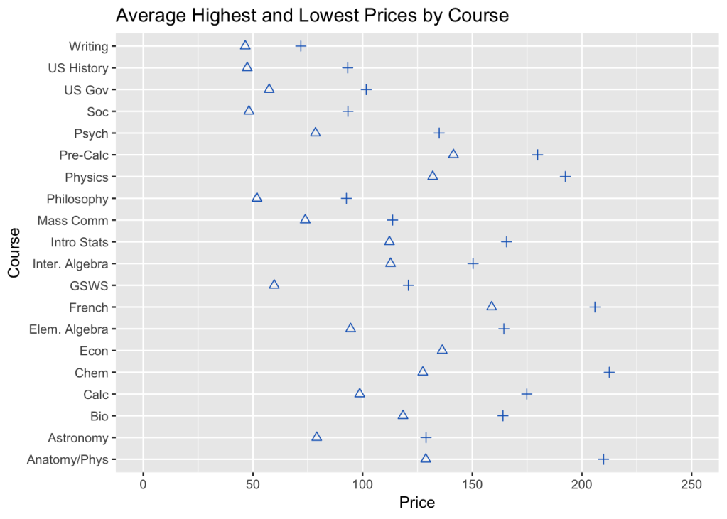 Across all available course materials formats, how do the average prices of the most expensive options and least expensive options vary across courses?