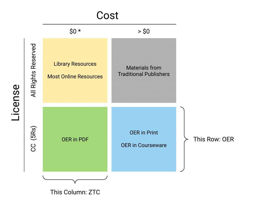 As the movement grew and more people began advocating for the adoption of OER in place of traditionally copyrighted materials in classes, some advocates chose to make cost the primary focus of their advocacy. This choice rotated licensing into a secondary priority. Now with two criteria to attend to (cost and licensing), there were twice as many types of materials to think about, advocate for, and advocate against. In its simplest form, the four types of materials can be characterized as follows: