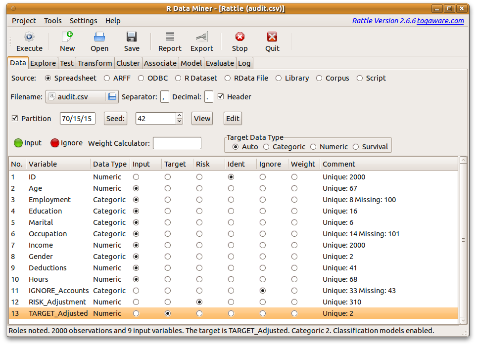 Rattle makes much of the data preparation (e.g., splitting into train/validate/test sets), exploration, transformation, model building, and evaluation process point and click. This is terrifically powerful for getting started quickly with machine learning tasks. Perhaps more importantly, Rattle logs all the R commands used throughout the process and lets you save them as standalone R scripts. Then you can further refine things from the command line (or in R Studio) and plug the scripts into whatever process you use to periodically run your analyses.