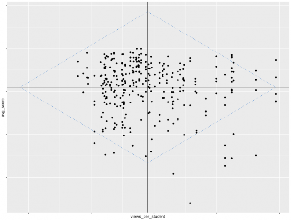 Each outcome in the course is placed in one of these four categories, as in the visualization below. We focus first on those outcomes in the lower right corner, where usage of OER is high but performance on aligned assessments is low. These are places where effort invested in improving OER is most likely to improve student learning. Below we have drawn a blue diamond three standard deviations out from the origin (mean OER usage on the x-axis and mean assessment performance on the y-axis) to make it easier to visually identify outliers in need of immediate attention.
