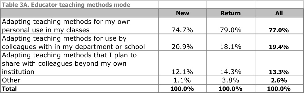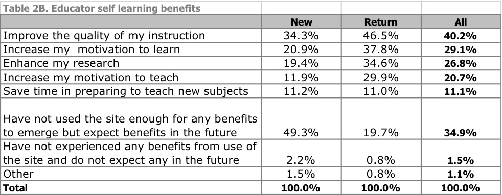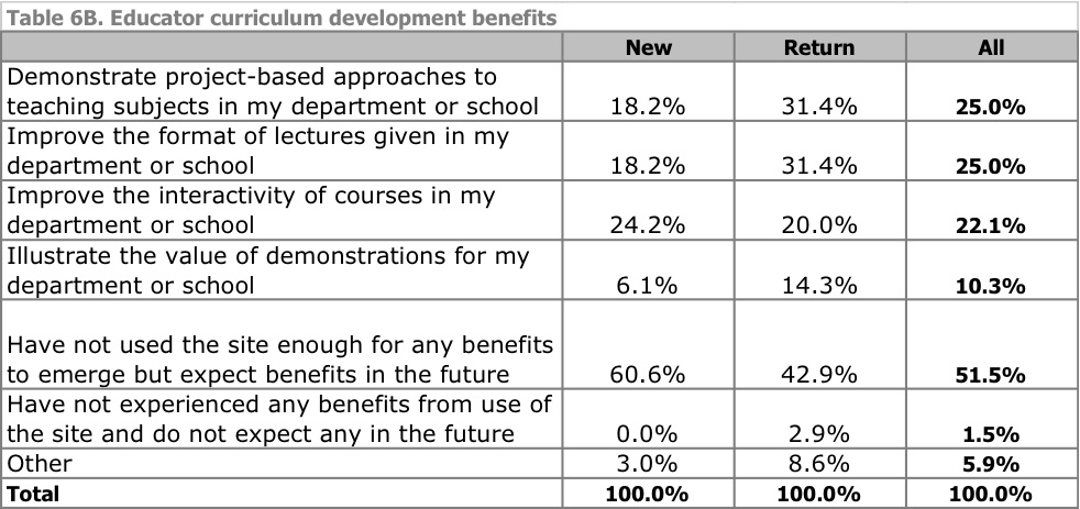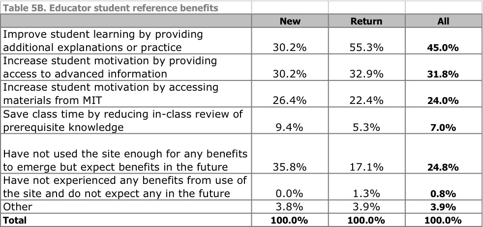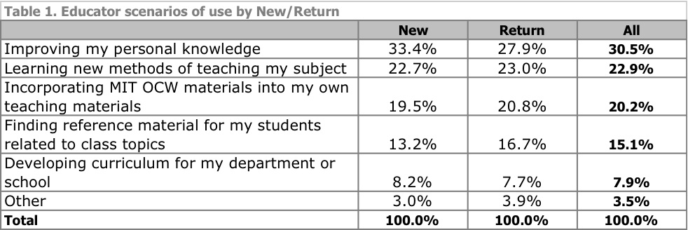 If I had to put a stake in the ground on how OCW generates benefit for others, right now I’d say primarily as a reference tool that is used for a range of academic activities, including independent (not distance) learning, curricular planning and development, supplements to classroom learning, academic planning, and professional development and problem-solving. Interestingly, many of these benefit from accessing the materials in situ, embedded in the OCW site and MIT curricular structure.